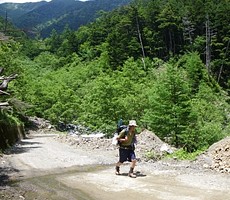 さらに2時間30分ほどかけて野呂川越に着いた。すると,反対方向,つまり仙丈岳から降りてきた大荷物を担いだ若者がいた。やるねぇ〜
