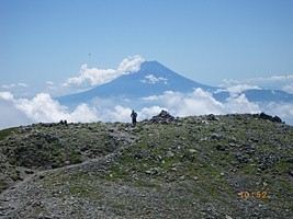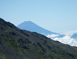 三峰岳の鞍部に着くと,富士山が姿を現した。有り難い。間ノ岳に登ることができれば,南アルプスで登っていない3000m峰は農鳥岳のみとなる。私のように出発点に戻ってこなければならない場合は,農鳥岳に登るのはきつい。ピストンするにしても4泊5日という日程が確保できないだろうし。