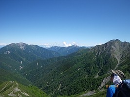 昨年一度歩いているコースなので,行程の全体像が把握できているためか疲労感は少ない。遙か下にこれからの道が見えているが溜め息は出てこない。渓を挟んで見えてくるのが北岳?だろうか。