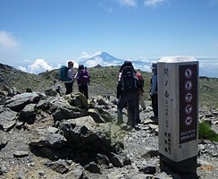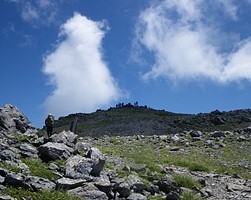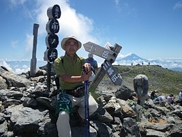 目前に頂上に集まる登山者の姿が見えてきた。そして,頂上。3年かかった間ノ岳の頂上だ。