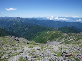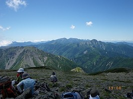 天候がとても安定している。昨年以上に雲が出てこない。森林限界を越えると,北アルプスの槍穂高まで見えてきたのには感激した。