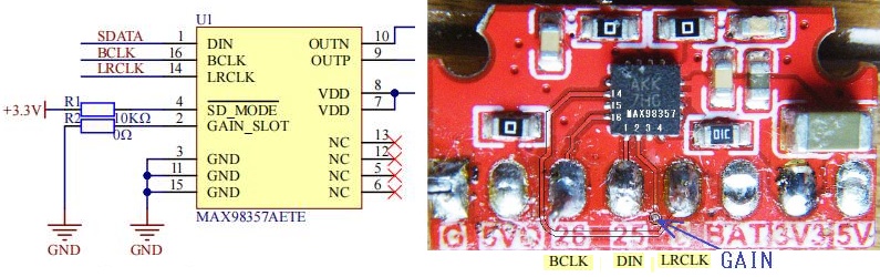 MAX98357はゲインを色々変えられるようで、デフォルトでは9dB。これが 3dB 〜 15dB の間で調整できるようなのですが、変化が良く分かりませんでした、以前やったことあるけど...やり方悪かったのかも(^^;) ただ、最大出力3Wもありますから、小さいスピーカーでは焼けてしまう可能性もありますね、恐らく。以前のAtomEchoのスピーカのように(^^;) だから、本体を小さくしようとしてスピーカを小型化、音も大きくなんてことは避けた方がいいかも。