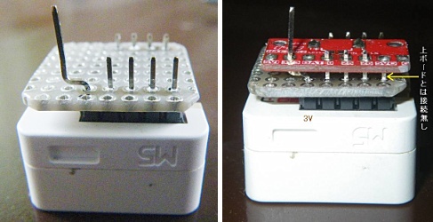 下のようにAtomS3へのセットを行う。LRCLK→G5、DIN→G6、BCLK→G7に接続し、3V同士は長いピンを曲げて差し込めるようにした。GNDはAtomS3の反対側のGNDピンへ配線。