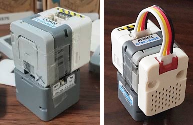 このように配線した基板を、BTN・スイッチを固定したケースに入れる。そのケースにさらにバッテリーが納まるようにして、AtomS3にスタックする。