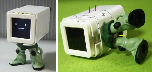 ボディスーツ加工2回目。ちょっと良くなったけど、反対側の面が溶け気味で引き攣った(^^;) ガチャでアトムニャン風の耳を探したけれどなかったので、こんなんで間に合わせた(^^;) 可愛さが弱くなったが、生意気そうになった..... 本体を包む?のプラバンが開いてしまうので、それを締め付ける?のU字型プラバンを用意。ギュッと押さえつけて、赤矢印の辺りで半田こてで溶着。ザグの両脚間に貫通してる3o程の穴に4oタップでネジ切りして?のプラバンに黄矢印のようにネジ止め。
