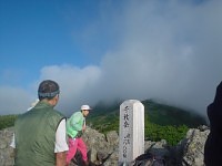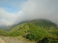 予定では5時間ほど先の荒川小屋までが本日の行程だ。森林限界を越えると,突然冷たい強風が吹き荒れてきた。3100mほどから上が雲の中だ。丸山や荒川小屋は見えているものの,荒川と赤石は頂上は雲の中だ。さらに,頂上を覆っている雲の遥か上にも雲はある。天気は良くない。6:27千枚岳頂上。