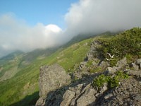 これを渡って1437mのピークを目指す。これがかなりの急登。以前は,トラバース道がありそれを通っていたが,斜面から落ちてくる沢を渡る鉄橋が度々崩れて,昨年再開通したものの今年はピーク越えになっていた。かなりのアルバイト。特にこのコースを下りに使うときつい。