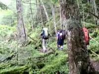 本谷山からもグーンと下って,権右衛門山の南斜面をトラバースする。この道は水平道なので楽なことは楽。ようやく霧が晴れてきて塩見岳が見えてきた。大分近づいた。人が歩くのって,かなり素晴らしい。