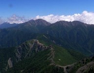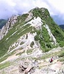 先ず天狗岩の下まで登る。ここの南側を巻くが,その先からはのんびりはできない。写真では塩見岳の切り立った様子は分からないが,途中まで見える登山道の先が見えない。あの岩場の何処かを通っているのだろうが...