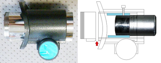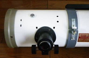 鏡筒に付いていた斜鏡(短径25mmかな)をそのまま使ったために、主鏡のフォーカス位置が鏡筒から5cmほどしかないので、接眼部を短く加工している。そのままではピントが合わないので、接眼筒の中にスペーサーを入れて接眼鏡を押し込んでいる。