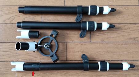 まず上中央図のようにAZ-GTiの三脚を切った。この三脚はしっかりと作られていて、ネジの部分は緩まないよう接着剤(?)で処理してある。ために分解できない所もあった(^^;) 困った私は、切った部分をつなぐために(赤矢印)切って不要になったパイプを使って繋ぐことにした。あとで、4ヶ所をビス止めする。